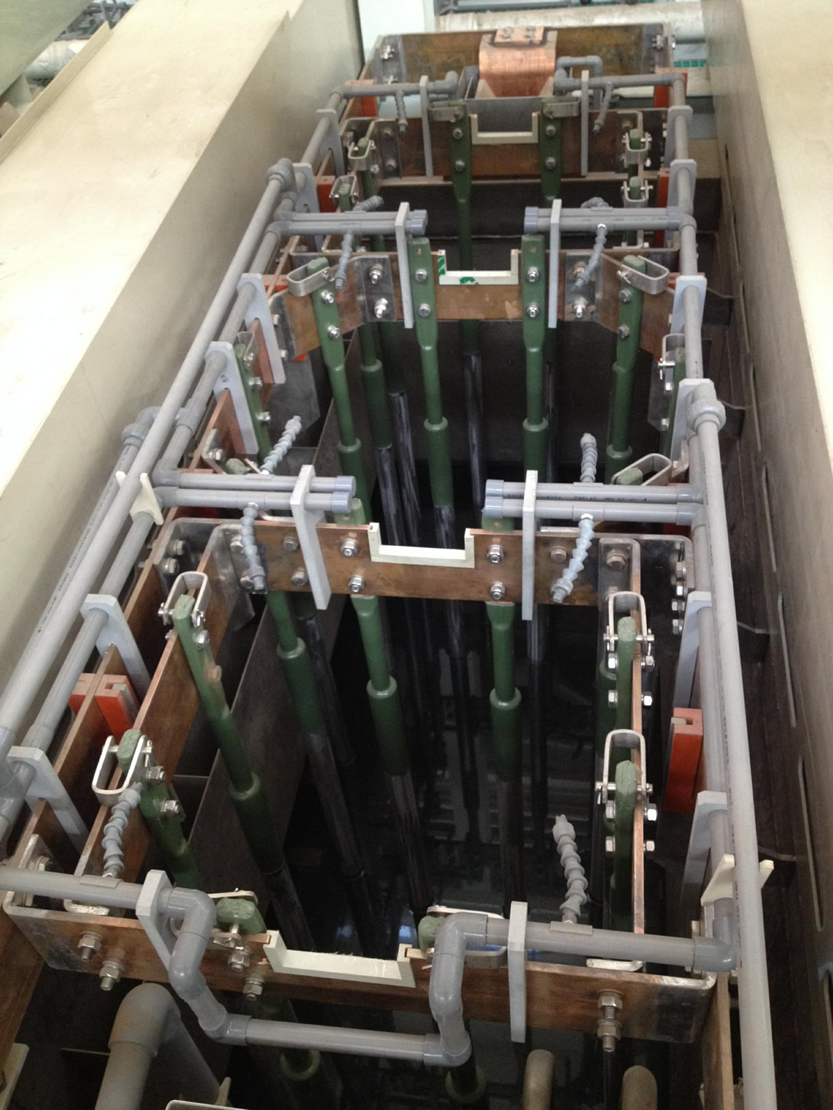 高效節(jié)能的陰陽(yáng)極排布,電流效率高,上下料輔助機(jī)構(gòu)。廢水、廢氣在線回收系統(tǒng),污染物零排放。
