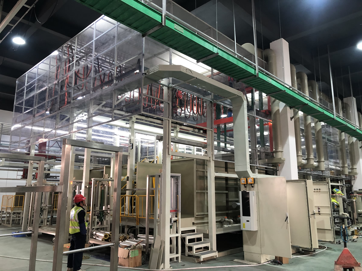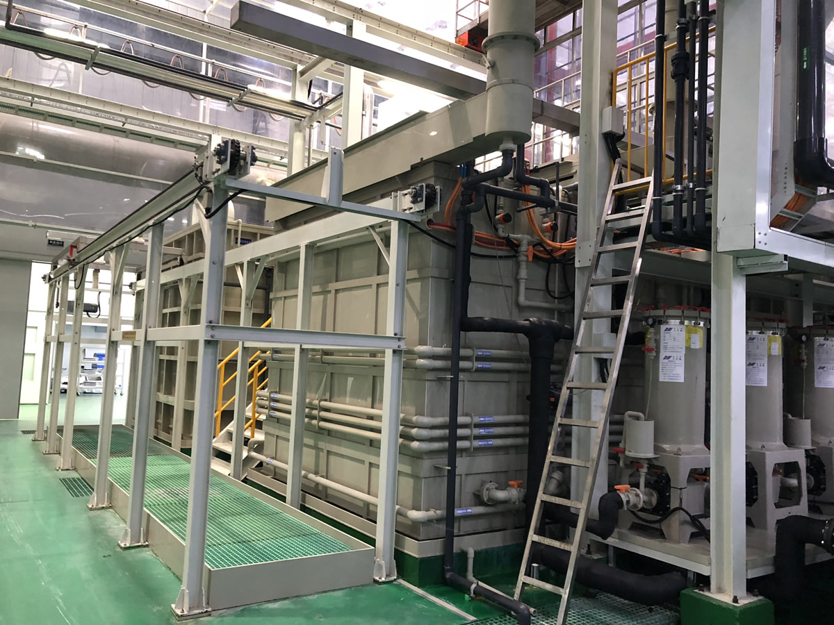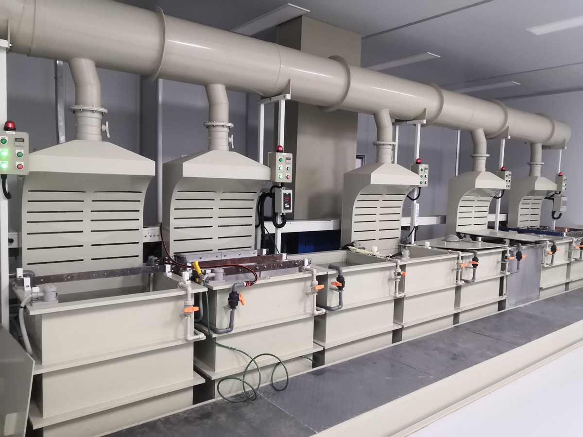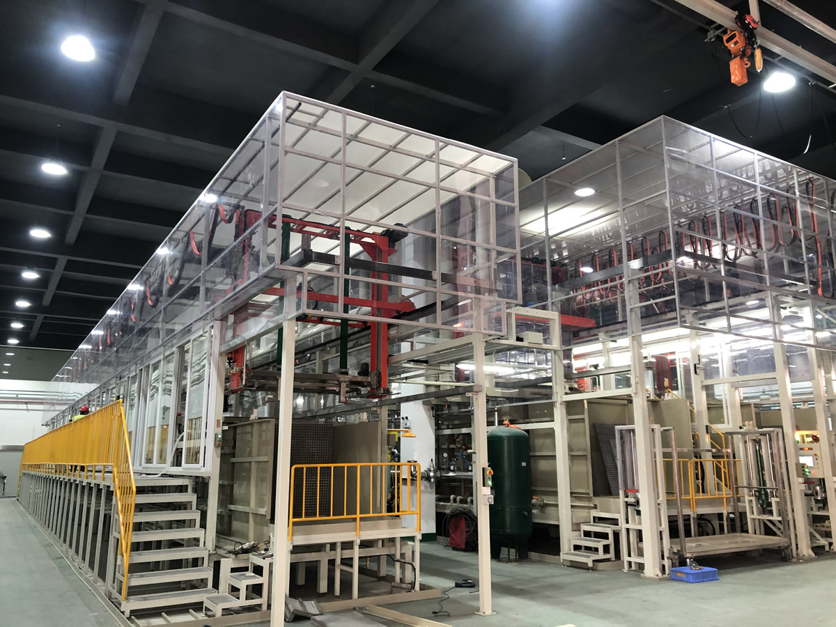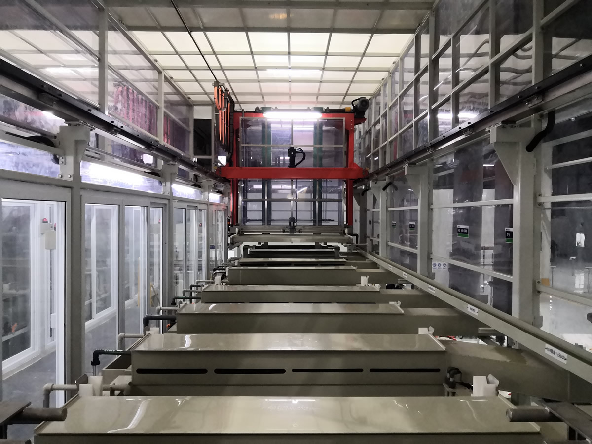 可實(shí)現(xiàn)清洗、陽極化不同工藝混線運(yùn)行,行車封閉式設(shè)計(jì)、產(chǎn)品出槽霧化噴淋。