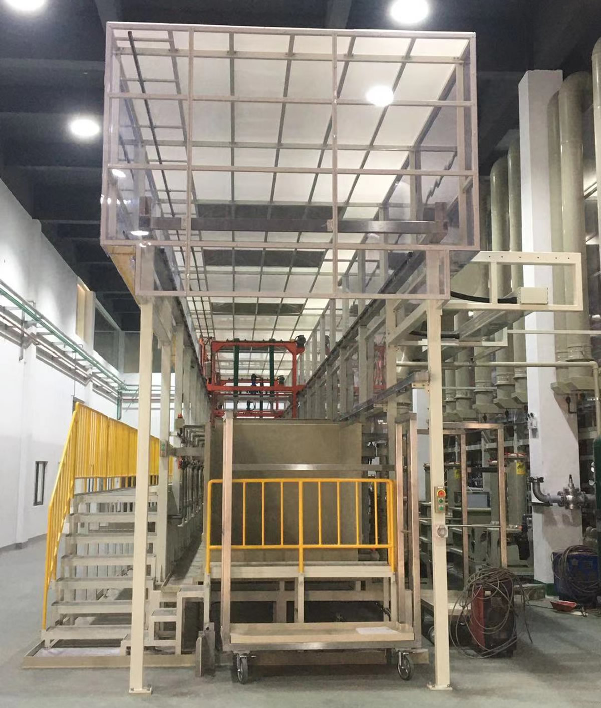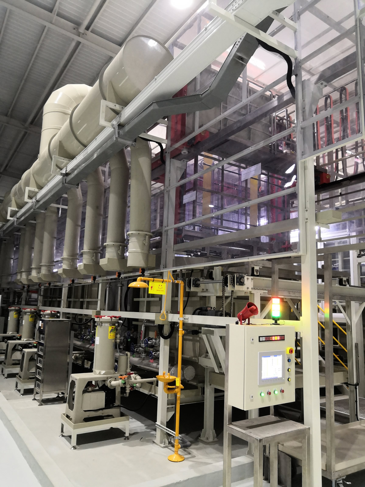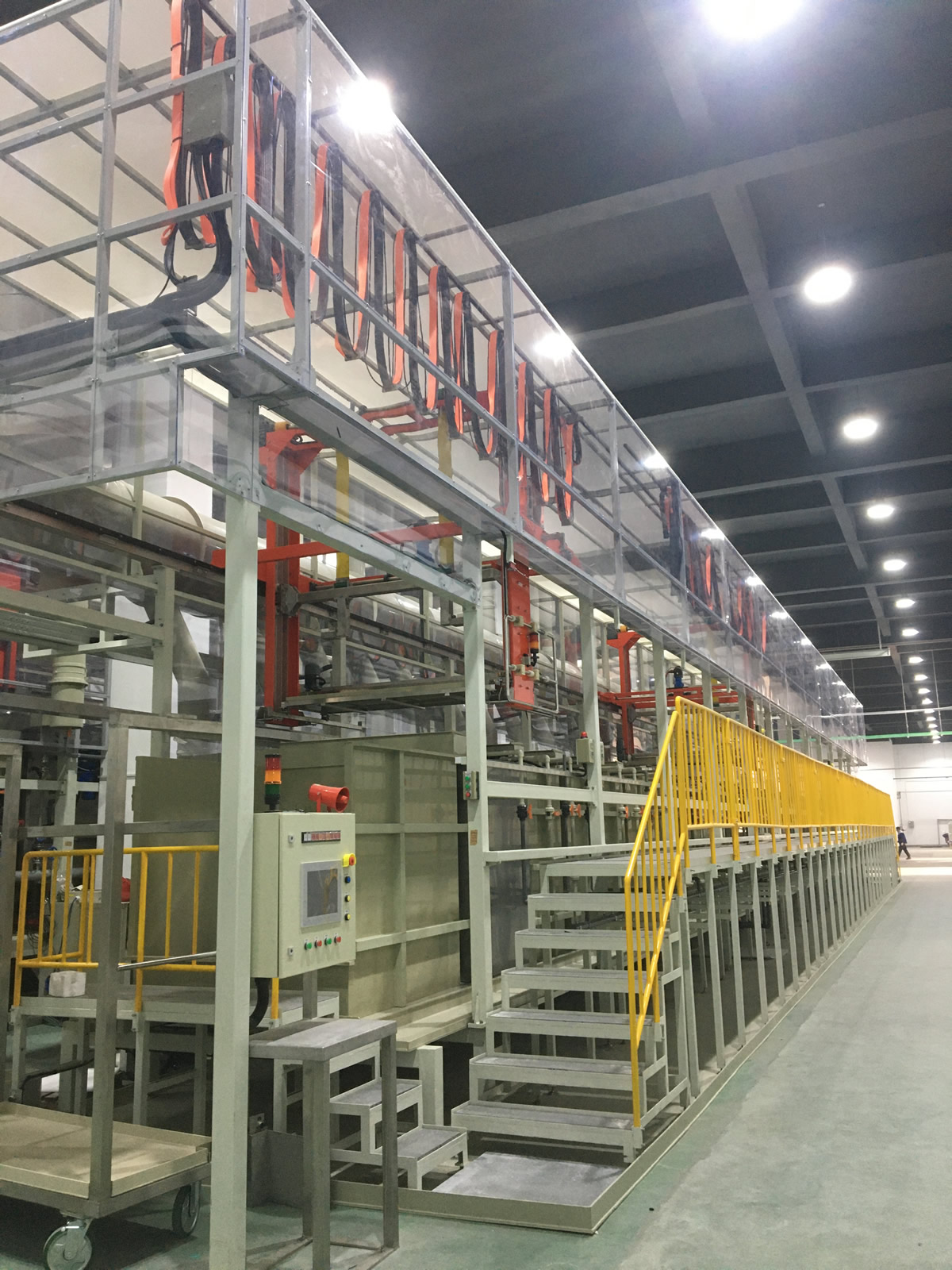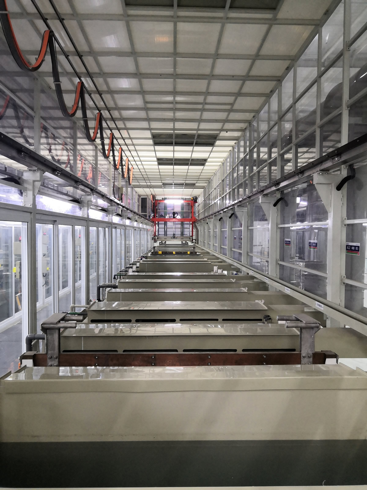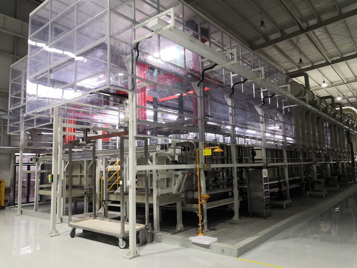 可實(shí)現(xiàn)清洗、陽極化不同工藝混線運(yùn)行,行車封閉式設(shè)計(jì)、產(chǎn)品出槽霧化噴淋。