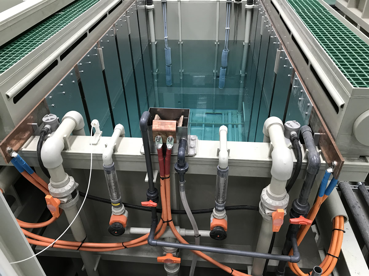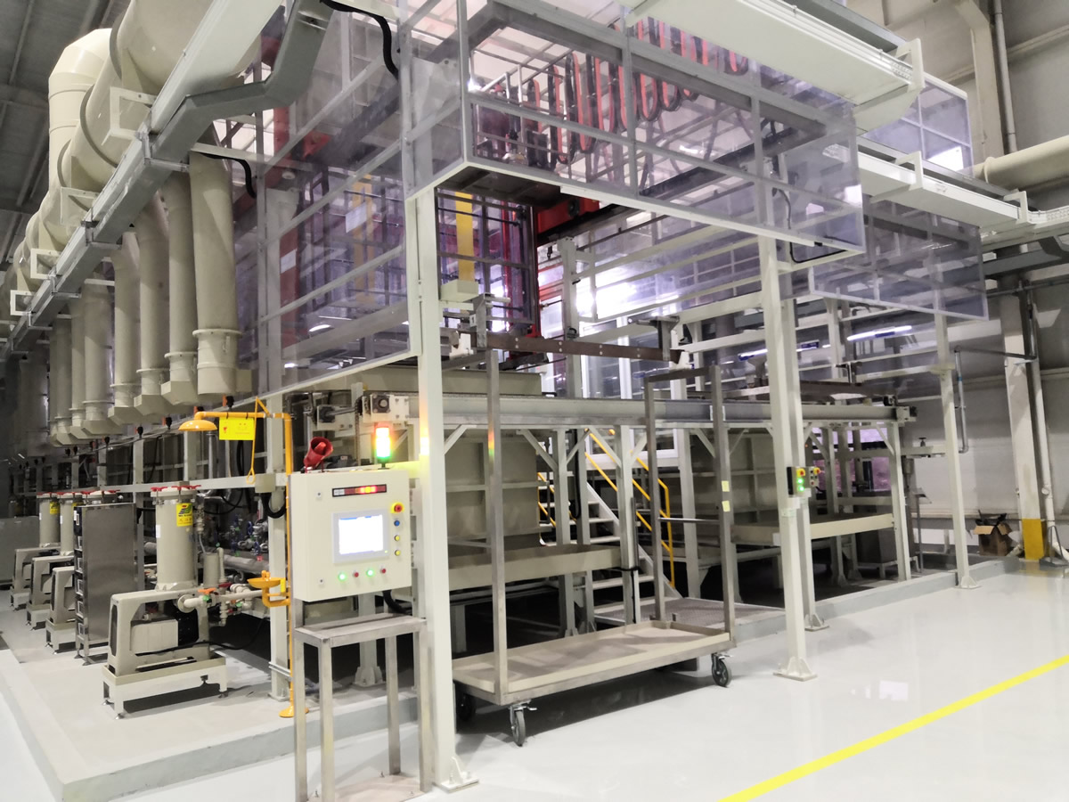 高效節(jié)能的陰陽極排布,電流效率高,上下料輔助機(jī)構(gòu)。廢水、廢氣在線回收系統(tǒng),污染物零排放。