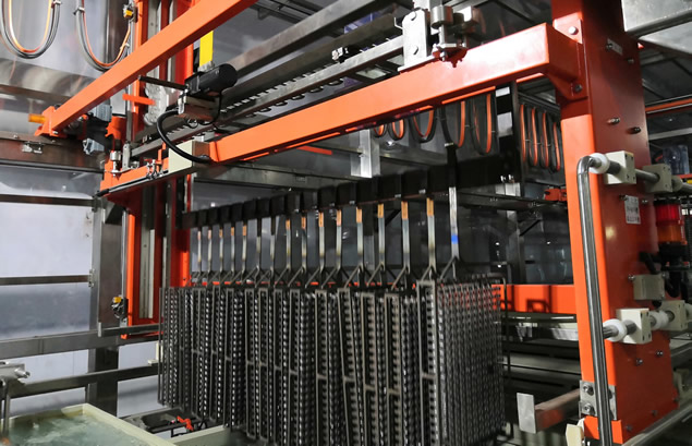 高效節(jié)能的陰陽(yáng)極排布,電流效率高,上下料輔助機(jī)構(gòu)。廢水、廢氣在線回收系統(tǒng),污染物零排放。